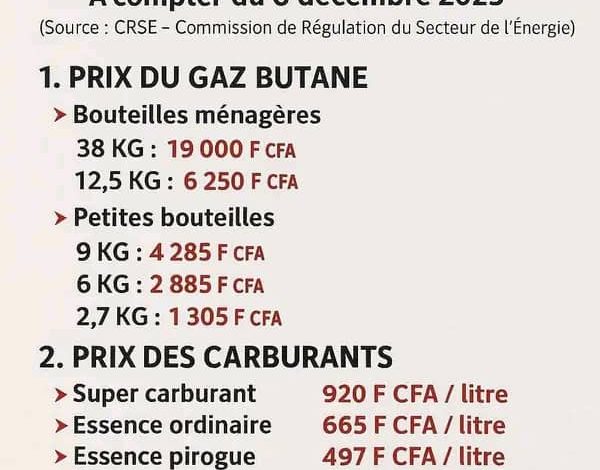 La Commission de Régulation du Secteur de l’Énergie (CRSE) a rendu publique, ce samedi 6 décembre 2025, la nouvelle grille tarifaire des produits pétroliers appliquée sur l’ensemble du territoire national. Cette révision des prix concerne le gaz butane, les carburants ainsi que d’autres produits dérivés, et s’inscrit dans le cadre du mécanisme d’ajustement périodique destiné à refléter l’évolution des coûts sur le marché international.