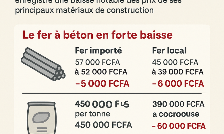 Le fer local affiche une baisse encore plus importante. Les 100 kg passent de 45.000 FCFA à 39.000 FCFA, tandis que la tonne passe de 450.000 FCFA à 390.000 FCFA, soit une diminution de 60.000 FCFA.
