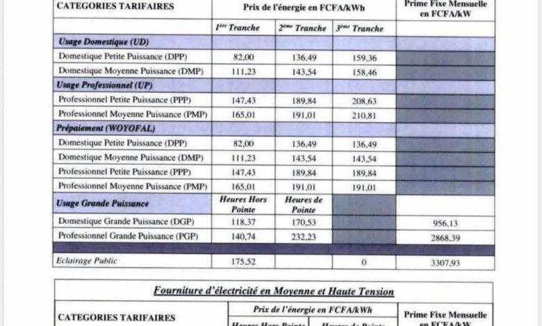 Pour les abonnĂ©s au systĂšme Woyofal (prĂ©paiement DPP), les tarifs sont fixĂ©s Ă 82,00 FCFA/kWh pour la premiĂšre tranche et 136,49 FCFA/kWh pour les tranches suivantes. Par ailleurs, des tarifs spĂ©cifiques en heures de pointe, comprises entre 19 heures et 23 heures, continueront de sâappliquer.